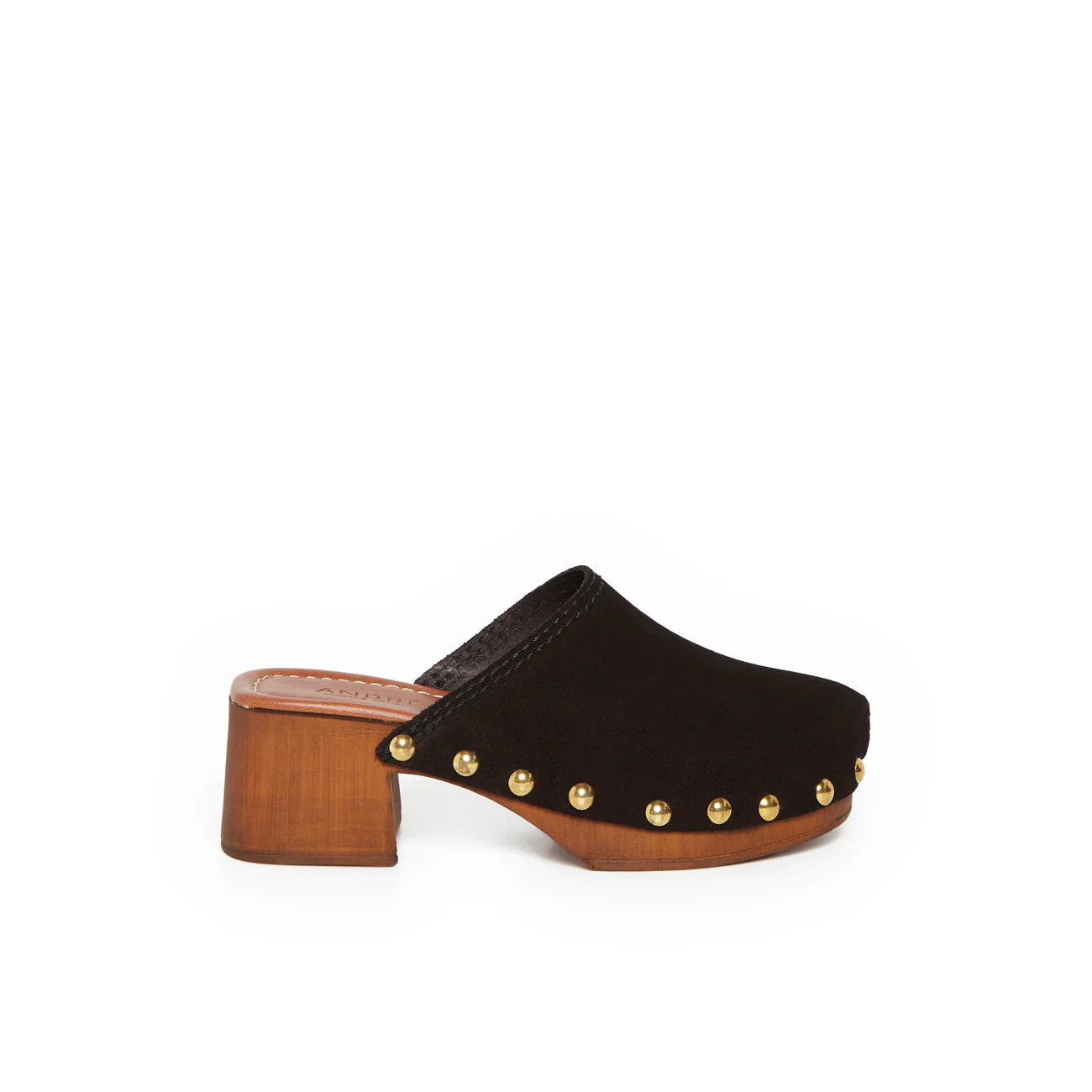 Son talon en bois verni de 6 cm assure stabilité et confort tout au long de la journée, tandis que les clous dorés ajoutent une touche rock chic irrésistible. Fabriqué en Italie, ce sabot noir revisite les codes rétro avec une touche ultra-moderne.