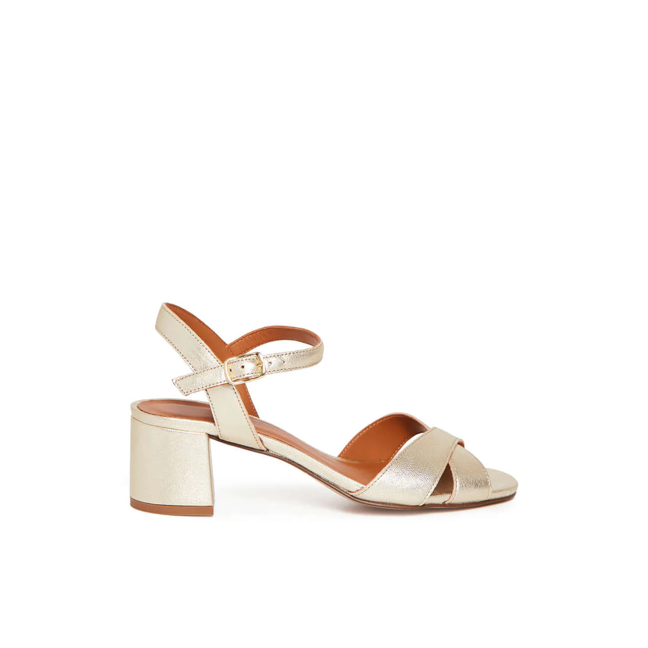 Affichez un style éclatant avec LIZA, la sandale en cuir de chèvre doré pensée pour sublimer vos tenues estivales avec brillance et raffinement. Fabriquée au Portugal, elle séduit par sa silhouette croisée sur l'avant et son talon bloc de 5,5 cm, idéal pour allier confort et allure féminine.