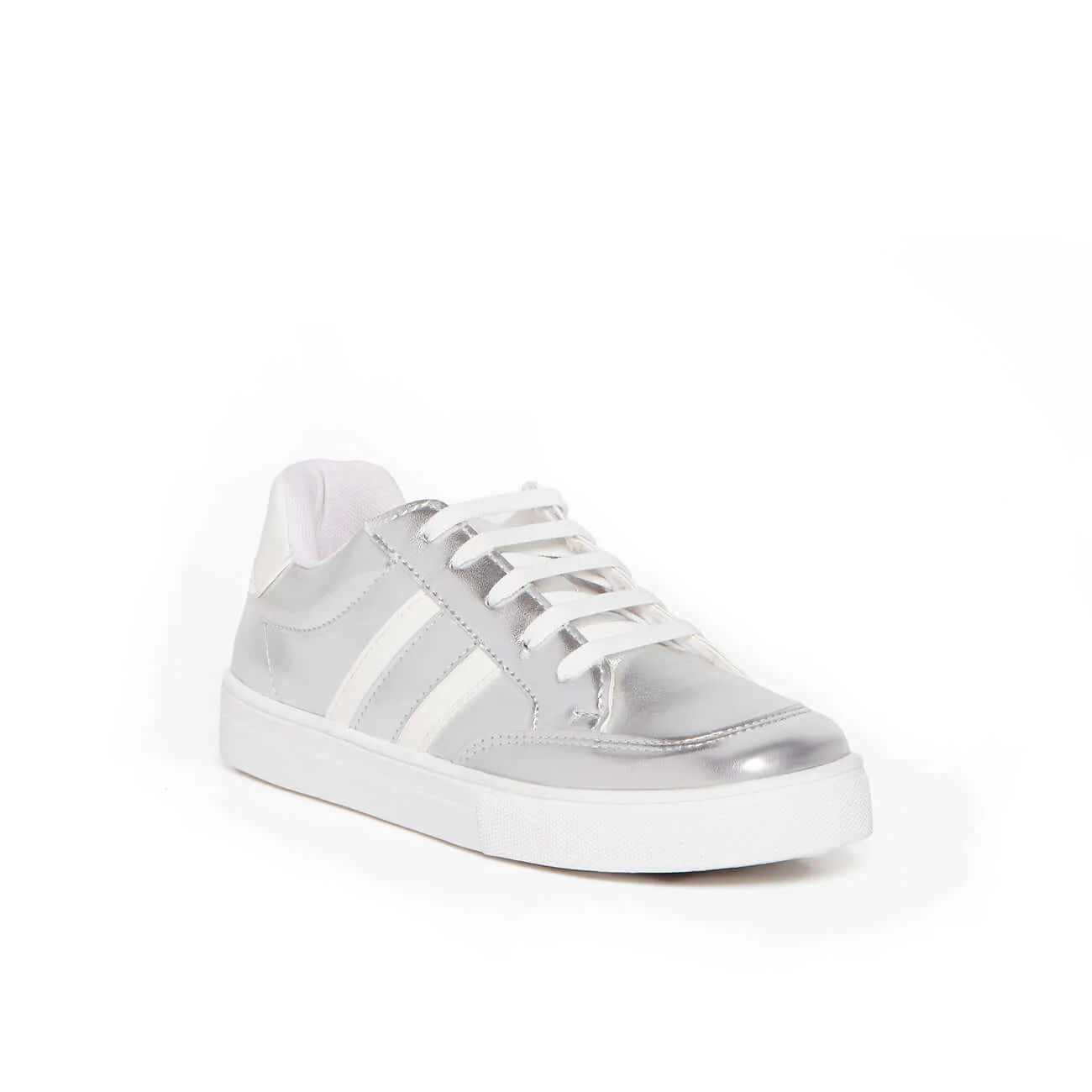 Brillez sans effort avec les sneakers MEYER en version argentée, des baskets modernes pensées pour illuminer vos looks du quotidien. Conçues dans une matière effet métallisé ultra-lumineuse, elles affichent un design dynamique rehaussé par des bandes contrastantes blanches et une semelle blanche épaisse qui assure confort et style.